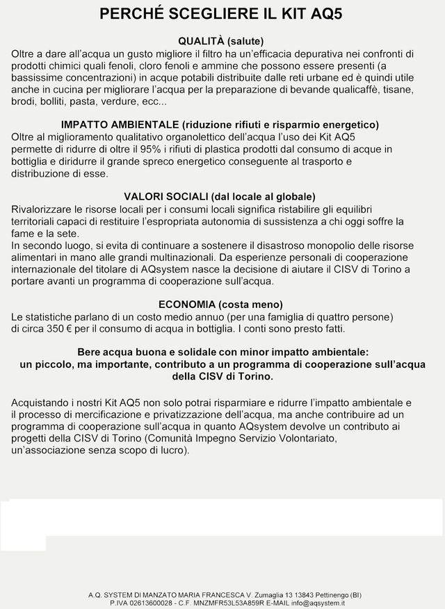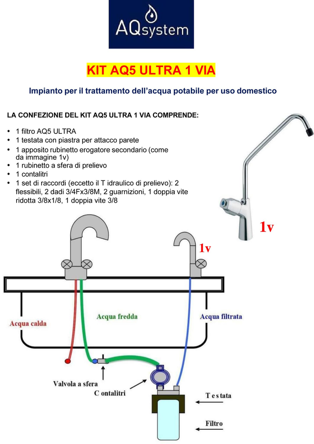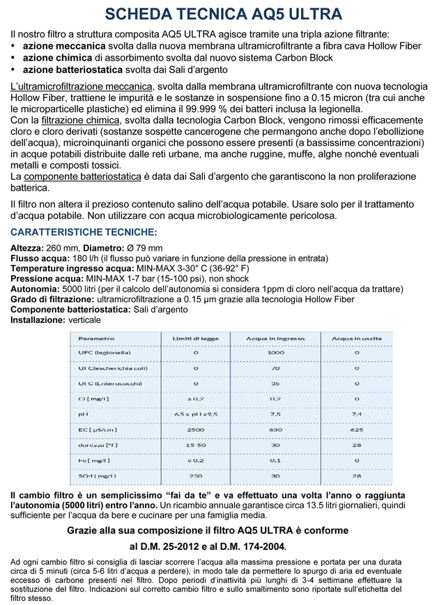 l nostro Kit AQ5 1 via con filtro AQ5 ULTRA grazie alla nuova tecnologia a ULTRAmicrofiltrazione con membrana a fibra cava Hollow Fiber e la tecnologia Carbon Block rende l’acqua del rubinetto più buona e sicura trattenendo le sostanze in sospensione fino a 0,15 micron (0,00015 millesimi).