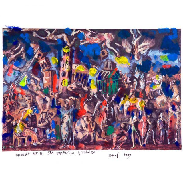 Questa stampa d'arte riproduce uno dei bozzetti usati da Dario Fo per il suo spettacolo: Lu Santo Jullare Francesco